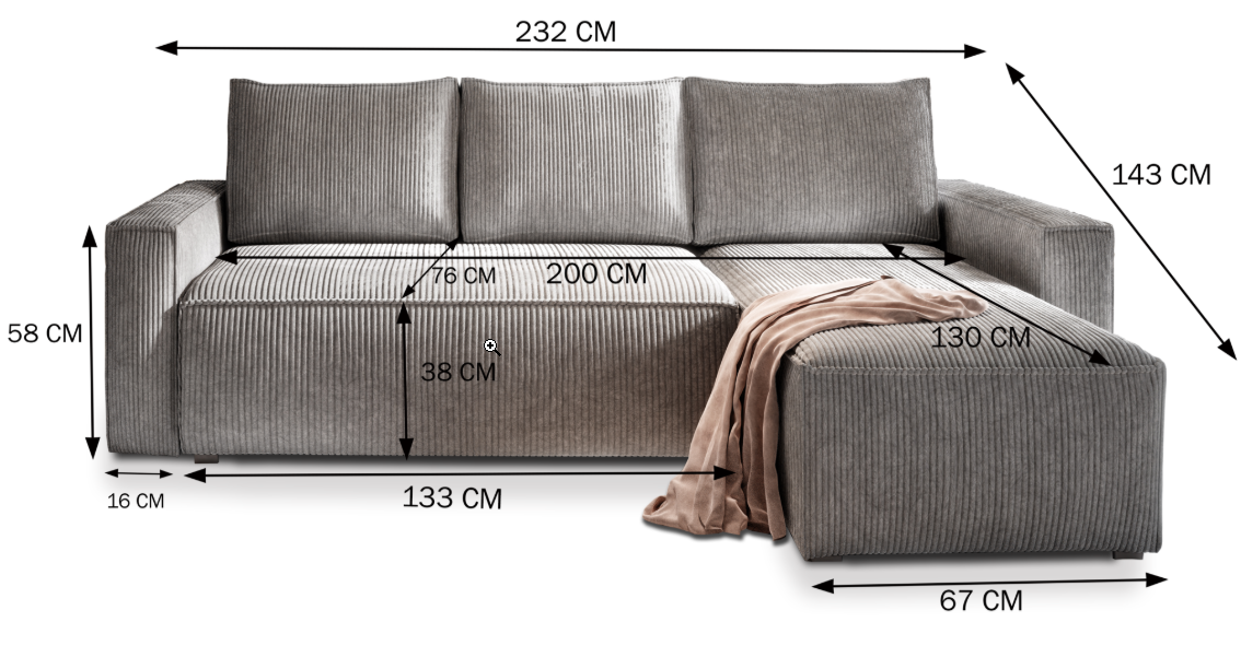 Specifications: Sofa: 246×160cm | Bed: 200×150cm | Corduroy velvet fabric | Universal corner design | Brand new, factory packaged